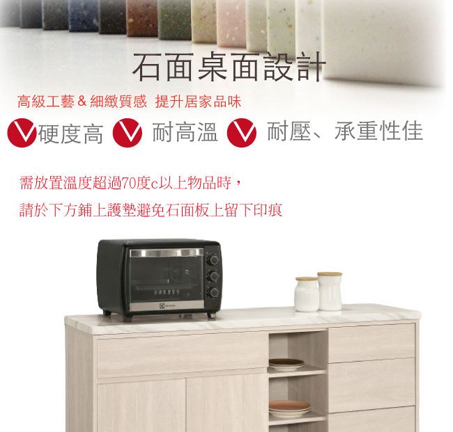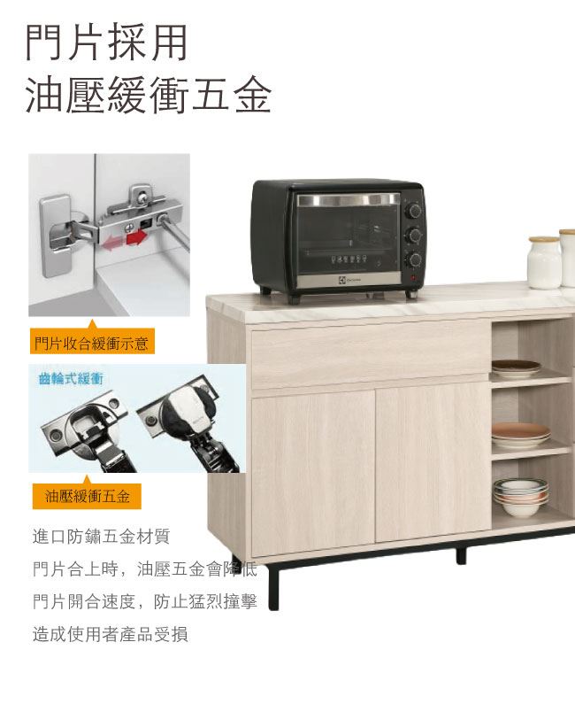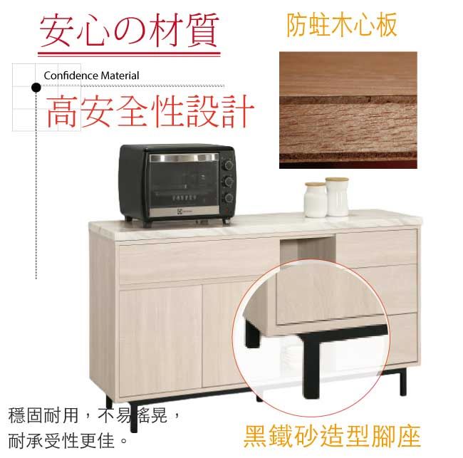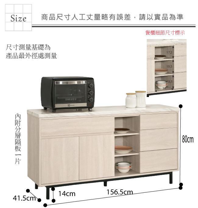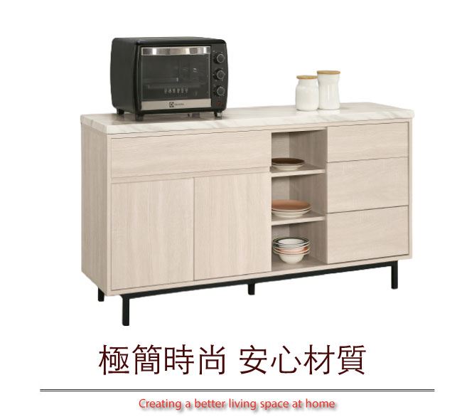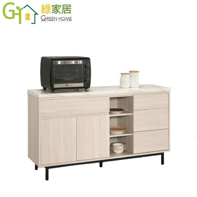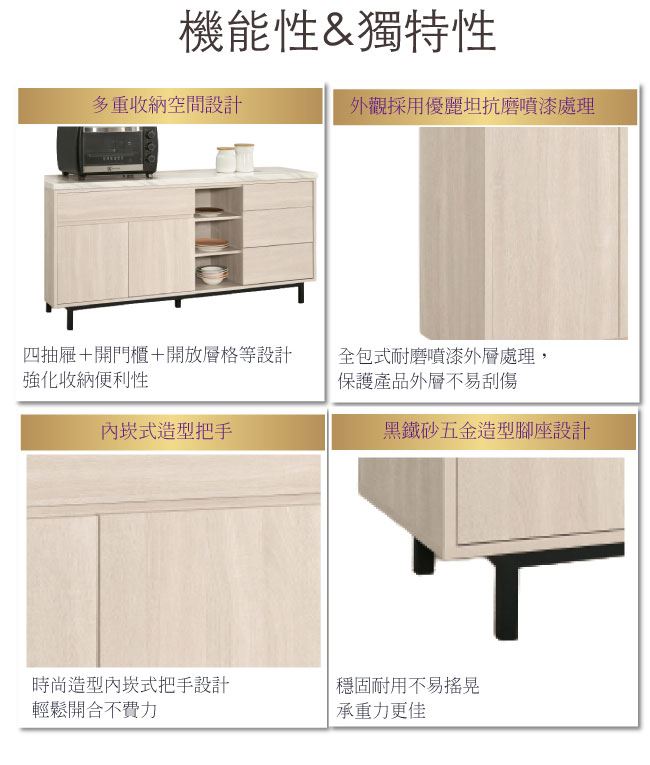 材質 | ◆產品名稱: 【綠家居】馬加柏 淺橡5.2尺二門四抽餐櫃/收納櫃 產品尺寸: 尺寸:(寬)156.5x(深)41.5x(高)80公分 ◆材質: 材質:防蛀木心板+黑鐵砂腳座+仿石面紋路木質桌面板 材質:五金滑軌結構+防夾手緩衝門片五金 塗漆:優利坦全包式耐磨噴漆處理