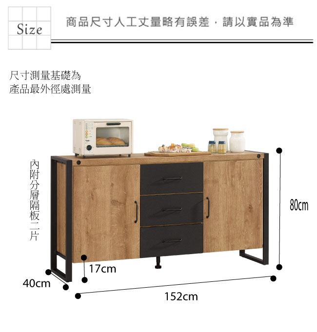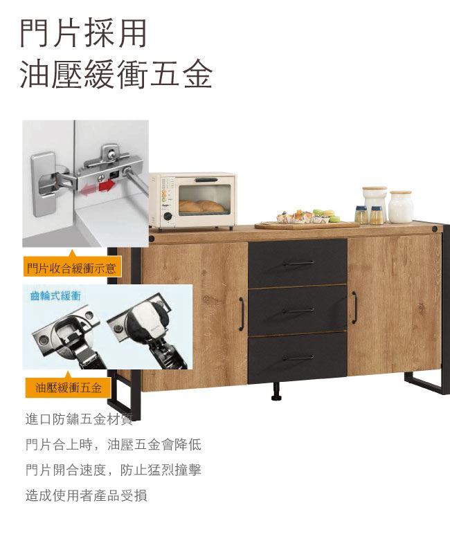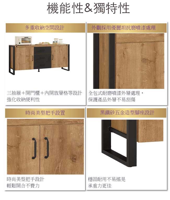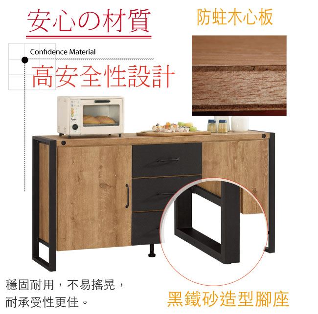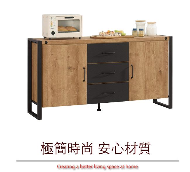 材質 | ◆產品名稱: 【綠家居】馬柏 雙色5.1尺二門三抽餐櫃/收納櫃 產品尺寸: 尺寸:(寬)152x(深)40x(高)80公分 ◆材質: 材質:防蛀木心板+黑鐵砂邊框&腳座 材質:五金滑軌結構+防夾手緩衝門片五金 塗漆:優利坦全包式耐磨噴漆處理