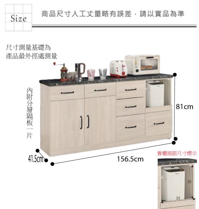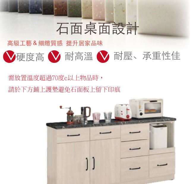材質 | ◆產品名稱: 【綠家居】卡提斯 淺橡5.2尺雲紋石面餐櫃 產品尺寸: 尺寸:(寬)156.5x(深)41.5x(高)81公分 ◆材質: 材質:防蛀木心板+防潮耐磨腳座+2cm雲紋石面桌面板 材質:五金滑軌結構+防夾手緩衝門片五金 塗漆:優利坦全包式耐磨噴漆處理