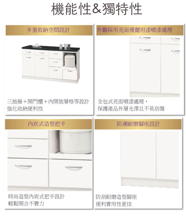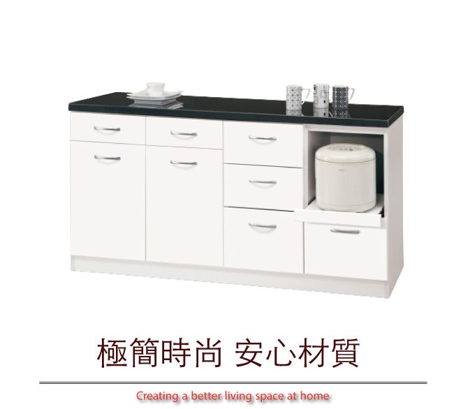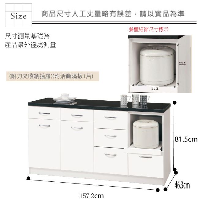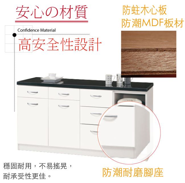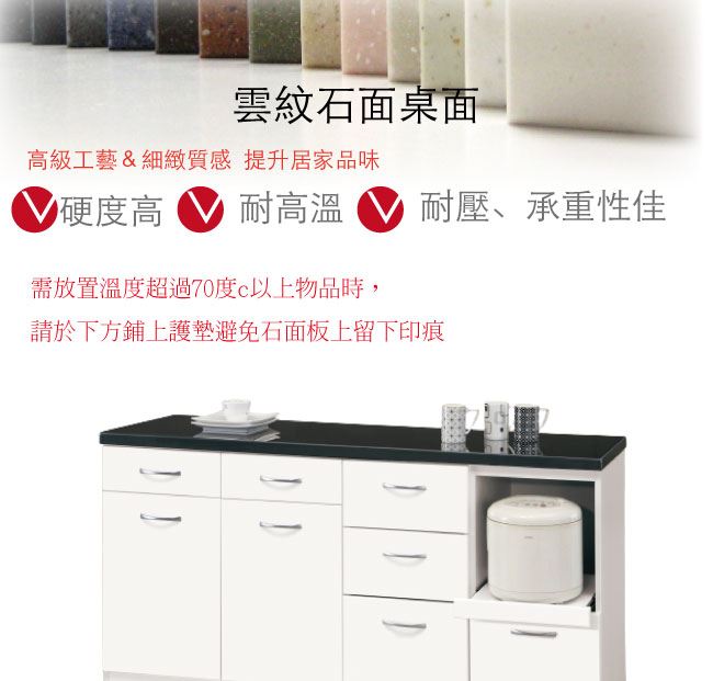 材質 | ◆產品名稱: 【綠家居】瑪特伊 時尚白5.2尺雲紋石面餐櫃 尺寸:(寬)157.2x(深)46.3x(高)81.5/公分 ◆材質: 材質:防蛀木心板+防潮MD板材+防潮耐磨腳座+五金滑軌結構+2cm雲紋石面板 噴漆:防潮亮面噴漆處理