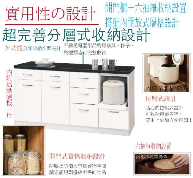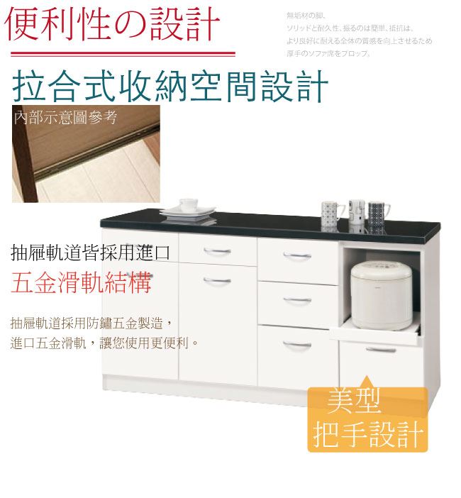 商品介紹 | 【綠家居】瑪特伊 時尚白5.2尺雲紋石餐櫃 時尚白色系+現代簡約風格+安心材質製造,整體採用防蛀木心板+防潮MD板材+防潮耐磨腳座+五金滑軌結構+2cm雲紋石面板等安心材質製造,產品外層採用防潮亮面噴漆處理搭配六抽屜(含刀叉專用收納抽屜)+拉合式層架+開門櫃+開放式收納層格等收納空間設計,全由專人配送到家,專業安心服務,替你省下更多時間! 【商品特色】 時尚白色系+現代簡約風格+安心材質製造,使用放心+搭配居家更便利 採用防蛀木心板+防潮MD板材+防潮耐磨腳座+五金滑軌結構+2cm雲紋石面板等安心材質製造 產品外層採用防潮亮面噴漆處理 搭配採用六抽屜(含刀叉專用收納抽屜)+開門櫃+拉合式層架+開放式收納層格等收納空間設計 此商品不需要DIY組立,此商品為組立後之成品 品質保證、專業設計、貼心服務 全由專人配送到家,專業安心服務,替您省下更多時間 |