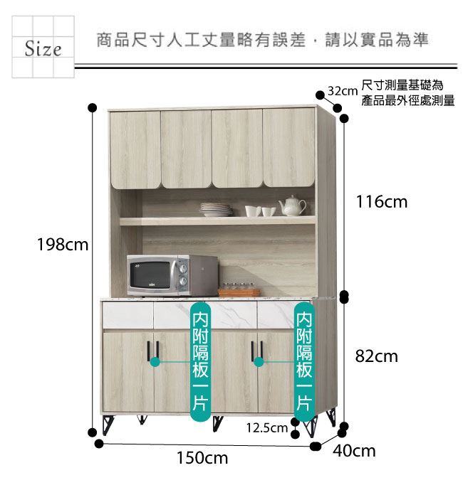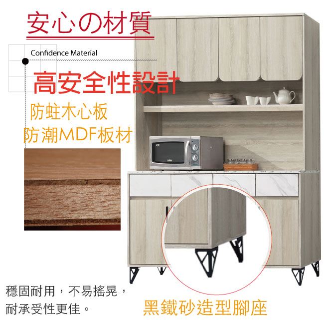 材質 | ◆產品名稱: 【綠家居】艾安德 雙色5尺八門四抽餐櫃組合 尺寸:(寬)150x(深)40x(高)198/公分 ◆材質: 材質:防蛀木心板+黑鐵砂腳座+五金滑軌結構+仿雲紋石面紋路木質面板 噴漆:防潮耐磨噴漆處理