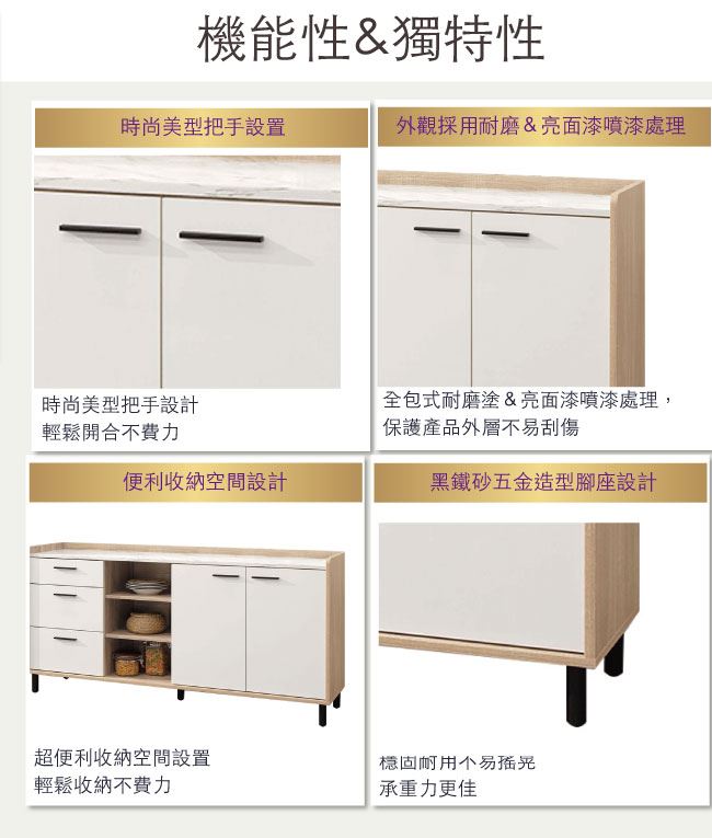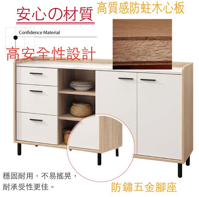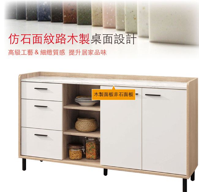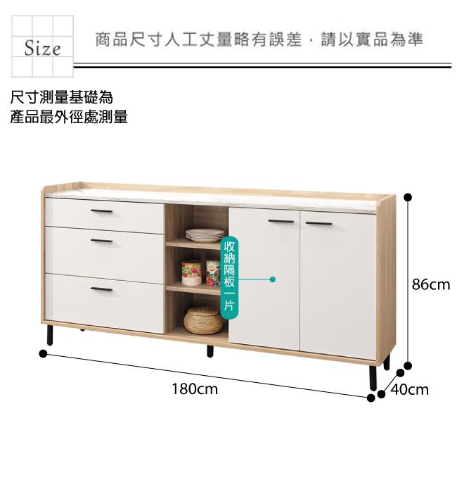 材質 | ◆產品名稱: 【綠家居】拉德 雙色6尺二門三抽餐櫃/收納櫃 尺寸:(寬)180x(深)40x(高)86/公分 ◆材質: 材質:防蛀木心板+五金滑軌結構+防鏽黑漆腳座+防夾手緩衝門片五金 外層採用耐磨&亮面噴漆處理