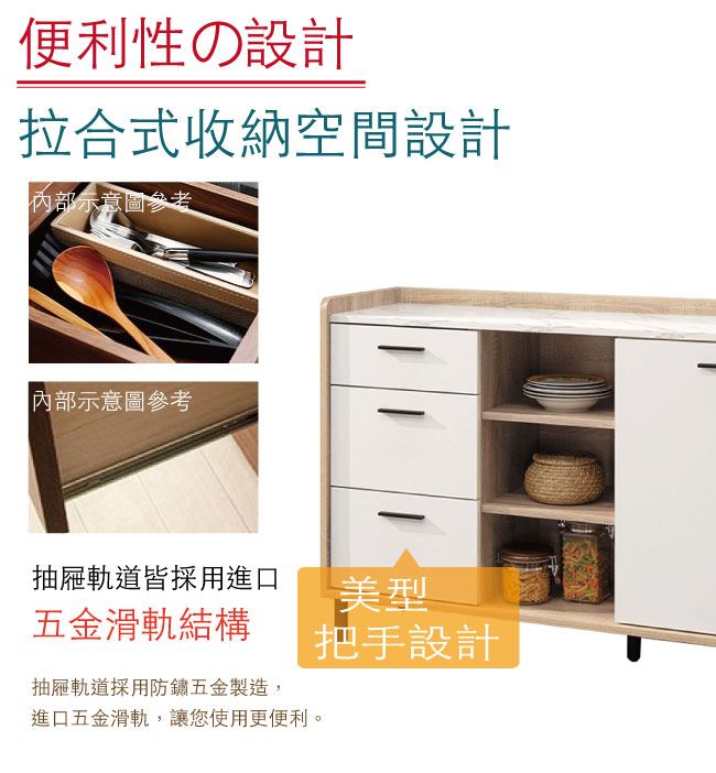 商品 介紹 | 【綠家居】拉德 雙色6尺二門三抽餐櫃/收納櫃 木紋雙色系+現代簡約風格+安心材質製造,整體採用防蛀木心板+五金滑軌結構+防鏽黑漆腳座+防夾手緩衝門片五金等安心材質製造,搭配採用開門櫃+三抽屜+內&外開放式收納等收納空間設計,全由專人配送到家,專業安心服務,替你省下更多時間! 【商品特色】 木紋雙色系+現代簡約風格+安心材質製造,使用放心+搭配居家更便利 採用防蛀木心板+五金滑軌結構+防鏽黑漆腳座+防夾手緩衝門片五金等安心材質製造 採用開門櫃+三抽屜+內&外開放式收納等收納空間設計 此商品不需要DIY組立,此商品為組立後之成品 全由專人配送到家,專業安心服務,替您省下更多時間 |