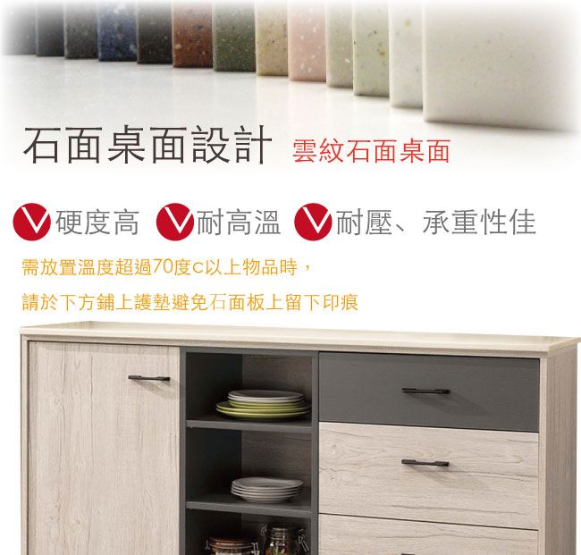材質 | ◆產品名稱: 【綠家居】賈維 雙色5尺雲紋石面餐櫃/收納櫃 尺寸:(寬)151x(深)40.5x(高)84.5/公分 ◆材質: 材質:防蛀木心板+五金滑軌結構+防鏽黑漆腳座+防夾手緩衝門片五金+12mm雲紋石面板 外層採用耐磨噴漆處理