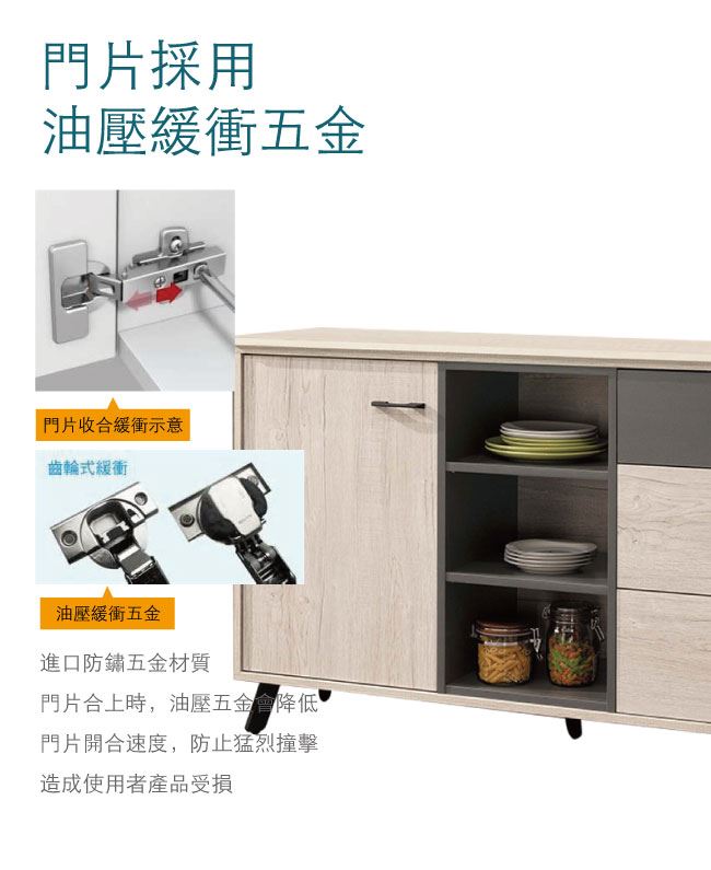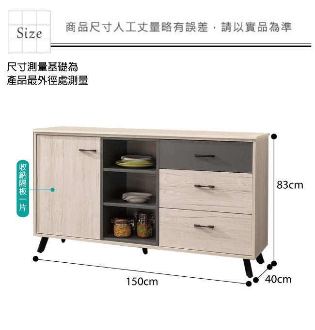 材質 | ◆產品名稱: 【綠家居】賈維 雙色5尺單門三抽餐櫃/收納櫃 尺寸:(寬)150x(深)40x(高)83/公分 ◆材質: 材質:防蛀木心板+五金滑軌結構+防鏽黑漆腳座+防夾手緩衝門片五金 外層採用耐磨噴漆處理