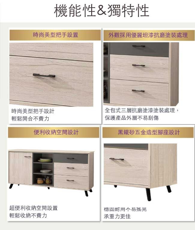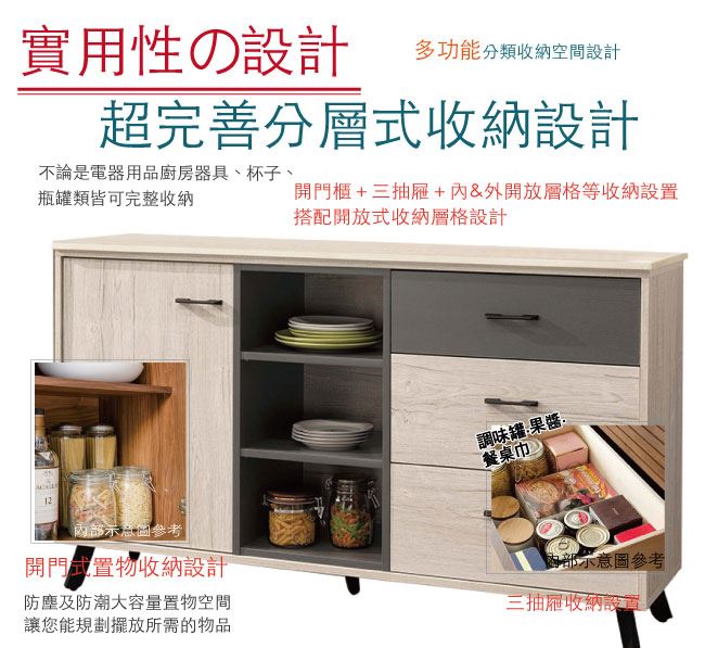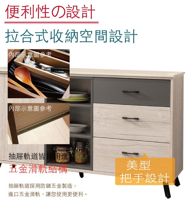 商品 介紹 | 【綠家居】賈維 雙色5尺單門三抽餐櫃/收納櫃 木紋雙色系+現代簡約風格+安心材質製造,整體採用防蛀木心板+五金滑軌結構+防鏽黑漆腳座+防夾手緩衝門片五金等安心材質製造,搭配採用開門櫃+三抽屜+內&外開放式收納等收納空間設計,全由專人配送到家,專業安心服務,替你省下更多時間! 【商品特色】 木紋雙色系+現代簡約風格+安心材質製造,使用放心+搭配居家更便利 採用防蛀木心板+五金滑軌結構+防鏽黑漆腳座+防夾手緩衝門片五金等安心材質製造 採用開門櫃+三抽屜+內&外開放式收納等收納空間設計 此商品不需要DIY組立,此商品為組立後之成品 全由專人配送到家,專業安心服務,替您省下更多時間 |