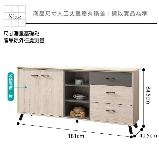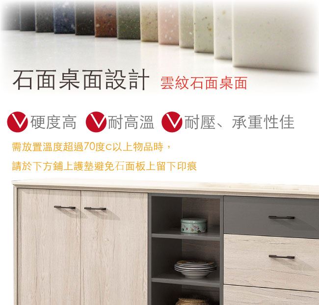 材質 | ◆產品名稱: 【綠家居】賈維 雙色6尺雲紋石面餐櫃/收納櫃 尺寸:(寬)181x(深)40.5x(高)84.5/公分 ◆材質: 材質:防蛀木心板+五金滑軌結構+防鏽黑漆腳座+防夾手緩衝門片五金+12mm雲紋石面板 外層採用耐磨噴漆處理