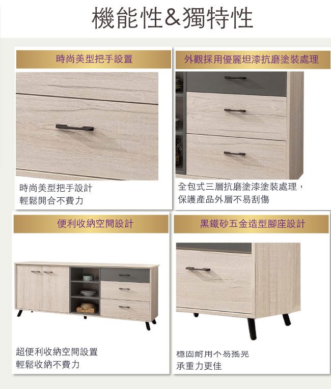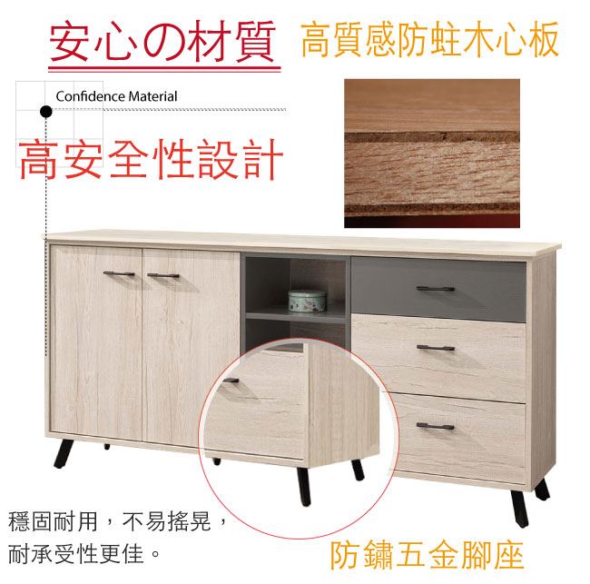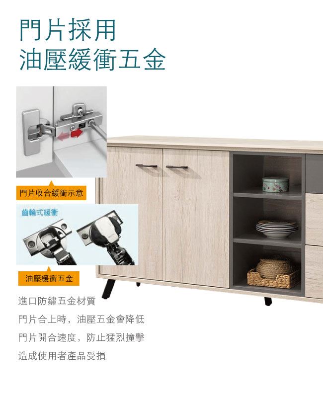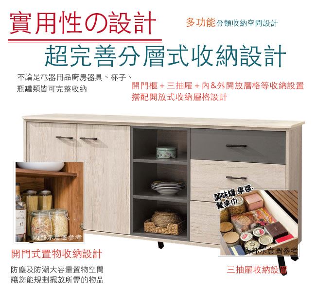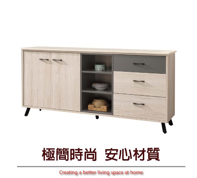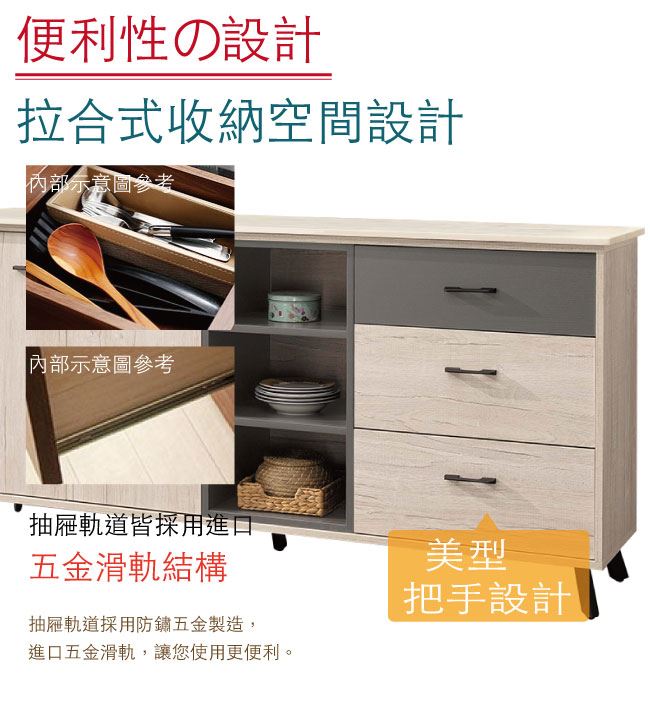 商品 介紹 | 【綠家居】賈維 雙色6尺單門三抽餐櫃/收納櫃 木紋雙色系+現代簡約風格+安心材質製造,整體採用防蛀木心板+五金滑軌結構+防鏽黑漆腳座+防夾手緩衝門片五金等安心材質製造,搭配採用開門櫃+三抽屜+內&外開放式收納等收納空間設計,全由專人配送到家,專業安心服務,替你省下更多時間! 【商品特色】 木紋雙色系+現代簡約風格+安心材質製造,使用放心+搭配居家更便利 採用防蛀木心板+五金滑軌結構+防鏽黑漆腳座+防夾手緩衝門片五金等安心材質製造 採用開門櫃+三抽屜+內&外開放式收納等收納空間設計 此商品不需要DIY組立,此商品為組立後之成品 全由專人配送到家,專業安心服務,替您省下更多時間 |
