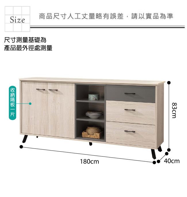 材質 | ◆產品名稱: 【綠家居】賈維 雙色6尺單門三抽餐櫃/收納櫃 尺寸:(寬)180x(深)40x(高)83/公分 ◆材質: 材質:防蛀木心板+五金滑軌結構+防鏽黑漆腳座+防夾手緩衝門片五金 外層採用耐磨噴漆處理