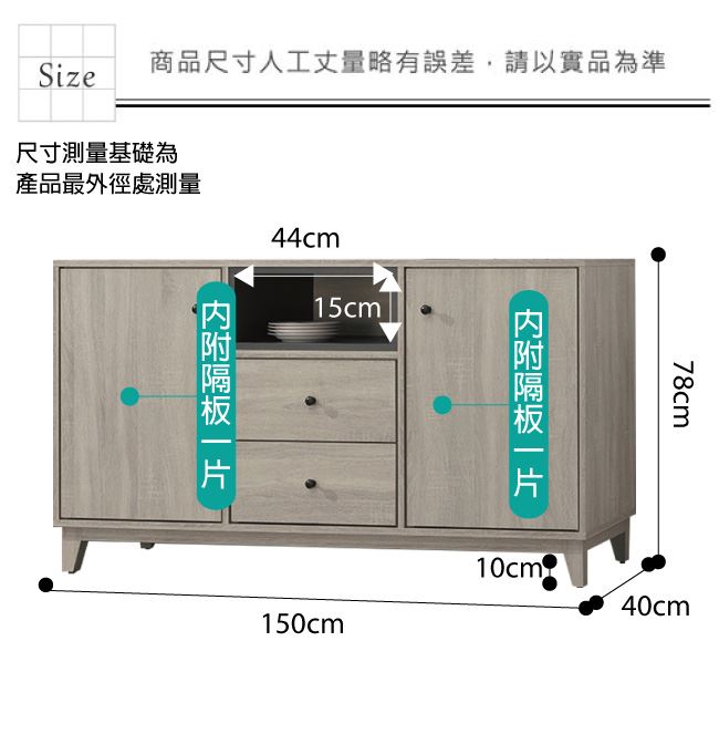 材質 | ◆產品名稱: 【綠家居】約納 時尚5尺二門二抽餐櫃/收納櫃 尺寸:(寬)150x(深)40x(高)78/公分 ◆材質: 材質:防蛀木心板+防夾手緩衝門片五金結構+防潮耐磨腳座+五金滑軌結構