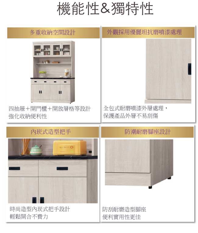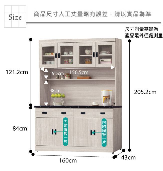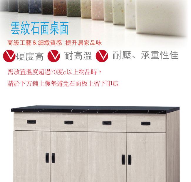 材質 | ◆產品名稱: 【綠家居】羅馬特 淺橡5.3尺雲紋石面高餐櫃組合 產品尺寸: 尺寸:(寬)160x(深)43x(高)205.2/公分 ◆材質: 材質:防蛀木心板+防潮耐磨腳座 材質:五金滑軌結構+12mm雲紋石面桌面板+防夾手緩衝門片五金 塗漆:優利坦全包式耐磨噴漆處理