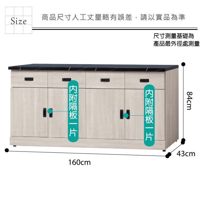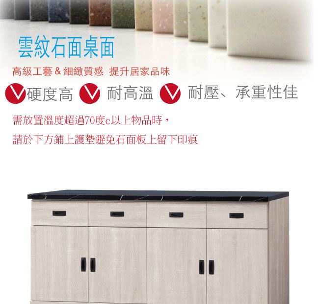 材質 | ◆產品名稱: 【綠家居】羅馬特 淺橡5.3尺雲紋石面餐櫃 產品尺寸: 尺寸:(寬)160x(深)43x(高)84/公分 ◆材質: 材質:防蛀木心板+防潮耐磨腳座 材質:五金滑軌結構+12mm雲紋石面桌面板+防夾手緩衝門片五金 塗漆:優利坦全包式耐磨噴漆處理