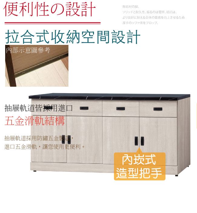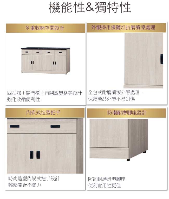 商品 介紹 | 【綠家居】羅馬特 淺橡5.3尺雲紋石面餐櫃 淺橡木紋色系+現代簡約風格+安心材質製造,整體採用防蛀木心板+五金滑軌結構+防夾手緩衝門片五金+防潮耐磨腳座+12m雲紋石面桌面板等安心材質製造,外層採用優利坦全包式耐磨噴漆處理搭配開門櫃+四抽屜+內開放式層格等收納設計,全由專人配送到家,專業安心服務,替你省下更多時間! 【商品特色】 淺橡木紋色系+現代簡約風格+安心材質製造,使用放心+搭配居家更便利 採用防蛀木心板+五金滑軌結構+防潮耐磨腳座+防夾手緩衝門片五金+12m雲紋石面桌面板等安心材質製造 開門櫃+四抽屜+內開放式層格等收納設計 品質保證、專業設計、貼心服務 全由專人配送到家,專業安心服務,替您省下更多時間 |