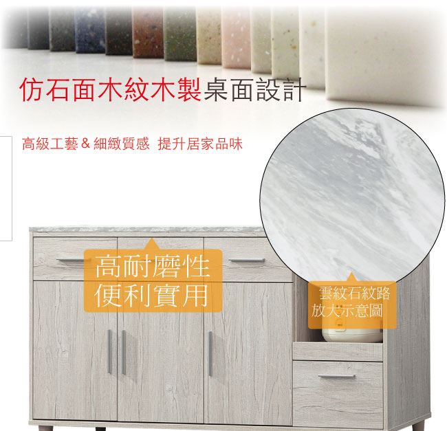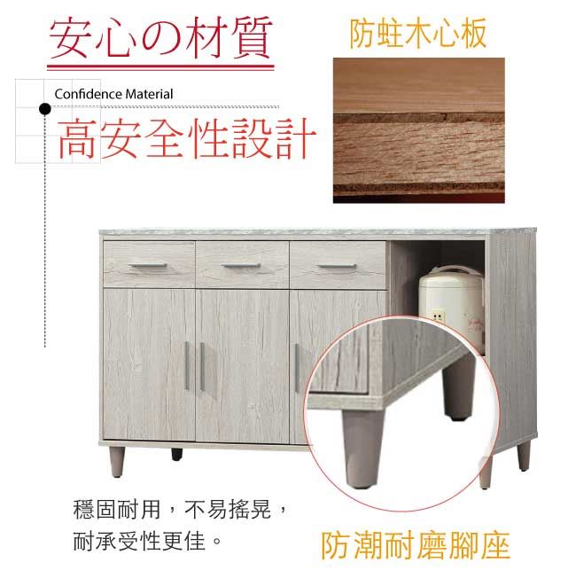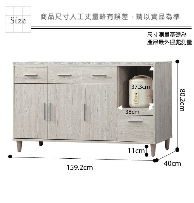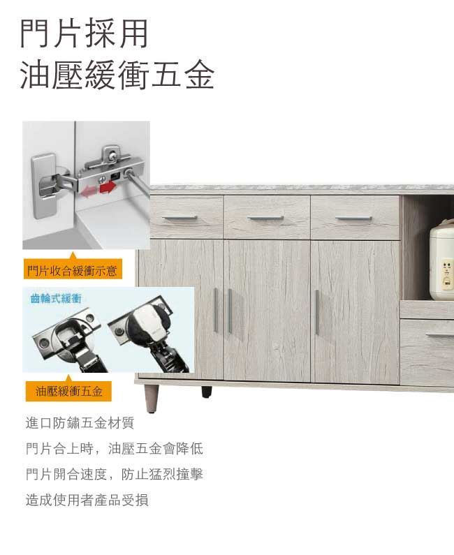 材質 | ◆產品名稱: 【綠家居】瑪波特 橡木紋5.3尺三門四抽餐櫃 產品尺寸: 尺寸:(寬)159.7x(深)40x(高)80.2/公分 ◆材質: 材質:防蛀木心板+防潮耐磨腳座 材質:五金滑軌結構+仿雲紋石紋路木質桌面板+防夾手緩衝門片五金 塗漆:優利坦全包式耐磨噴漆處理