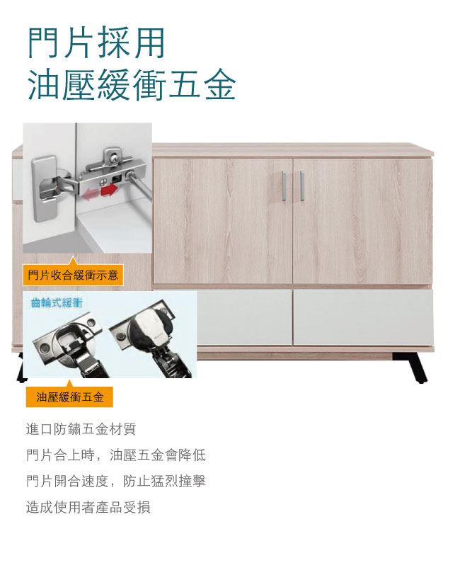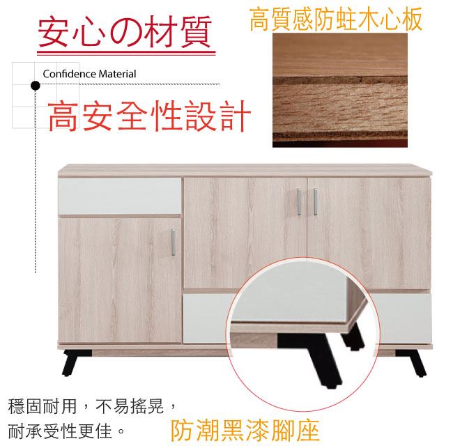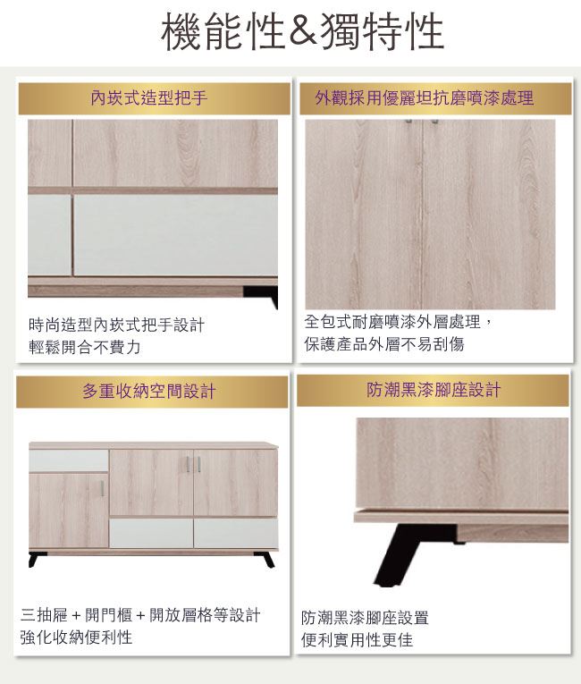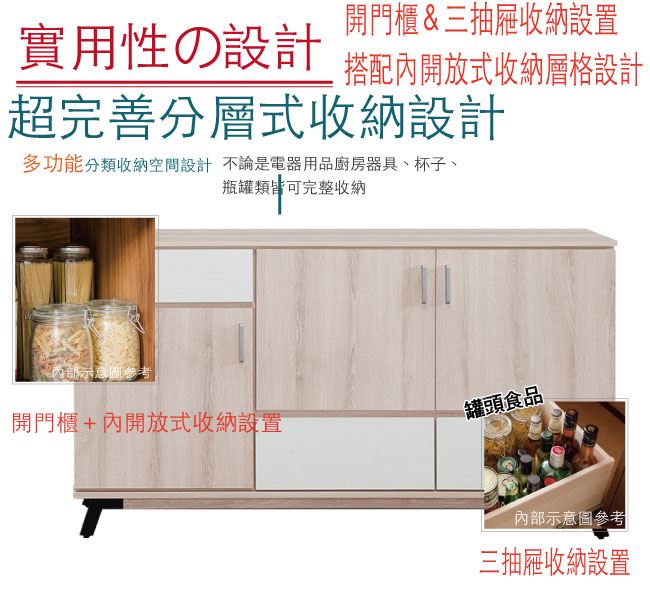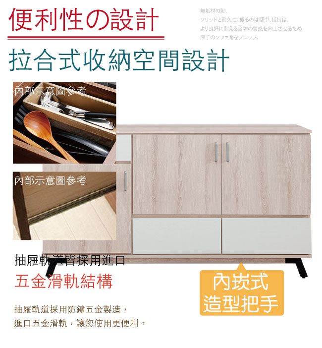 商品 介紹 | 【綠家居】魯蒂 現代5.1尺三門三抽餐櫃/收納櫃 木紋雙色系+現代簡約風格+安心材質製造,整體採用防蛀木心板+五金滑軌結構+防潮黑漆腳座+防夾手緩衝門片五金等安心材質製造,外層採用優利坦全包式耐磨噴漆處理搭配採用開門櫃+內開放式收納+三抽屜等便利設計,全由專人配送到家,專業安心服務,替你省下更多時間! 【商品特色】 木紋雙色系+現代簡約風格+安心材質製造,使用放心+搭配居家更便利 採用防蛀木心板+五金滑軌結構+防潮黑漆腳座+防夾手緩衝門片五金等安心材質製造 採用開門櫃+內開放式收納+三抽屜等便利設計 此商品不需要DIY組立,此商品為組立後之成品 品質保證、專業設計、貼心服務 全由專人配送到家,專業安心服務,替您省下更多時 |