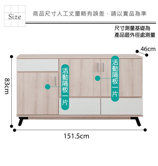 材質 | ◆產品名稱: 【綠家居】魯蒂 現代5.1尺三門三抽餐櫃/收納櫃 產品尺寸: 尺寸:(寬)151.5(深)46x(高)83/公分 ◆材質: 材質:防蛀木心板+五金滑軌結構+防潮黑漆腳座+防夾手緩衝門片五金 塗漆:優利坦全包式耐磨噴漆處理