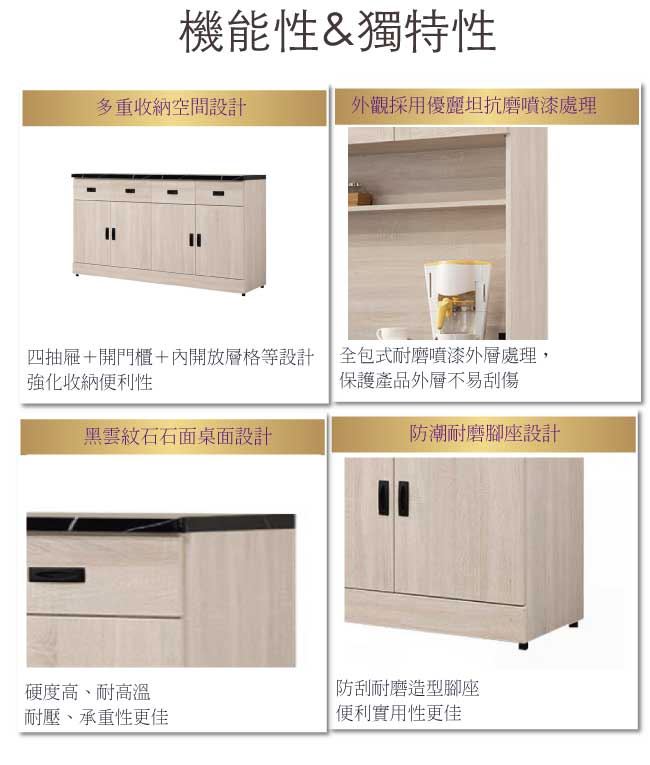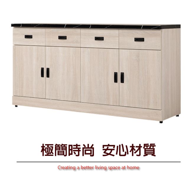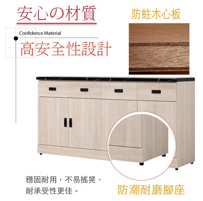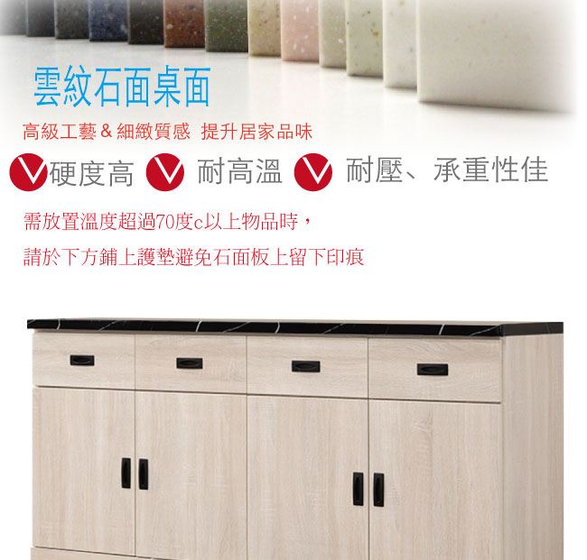 材質 | ◆產品名稱: 【綠家居】米麗泰 淺橡5.3尺雲紋石面餐櫃 產品尺寸: 尺寸:(寬)160x(深)43x(高)84公分 ◆材質: 材質:防蛀木心板+防潮耐磨腳座+2cm雲紋石面桌面板 材質:五金滑軌結構+防夾手緩衝門片五金 塗漆:優利坦全包式耐磨噴漆處理