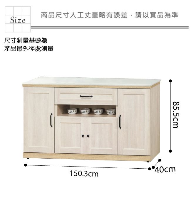 尺寸:(寬)150.3(深)40(高)85.5公分 ◆材質: 材質:防蛀木心板+防潮耐磨腳座+防夾手緩衝門片五金+五金滑軌結構+12mm雲紋石面板 噴漆:防潮耐磨噴漆處理