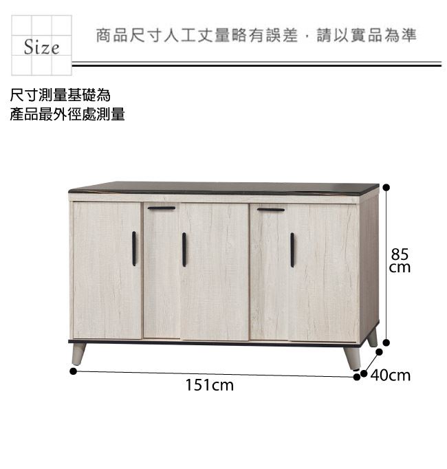 尺寸:(寬)151(深)40(高)85公分 ◆材質: 材質:防蛀木心板+防潮實木腳座+防夾手緩衝門片五金+12mm雲紋石面桌面板 噴漆:防潮耐磨噴漆處理