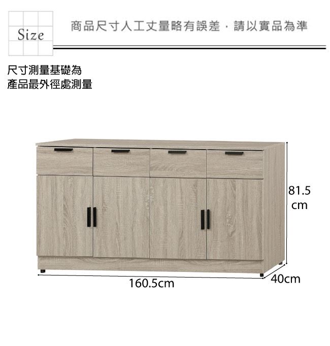 低餐櫃尺寸:(寬)160.5(深)40(高)81.5公分 ◆材質: 材質:防蛀木心板+防潮耐磨腳座+防夾手緩衝門片五金+五金滑軌結構 噴漆:防潮耐磨噴漆處理