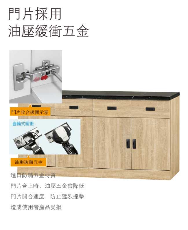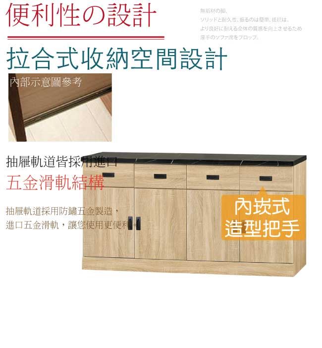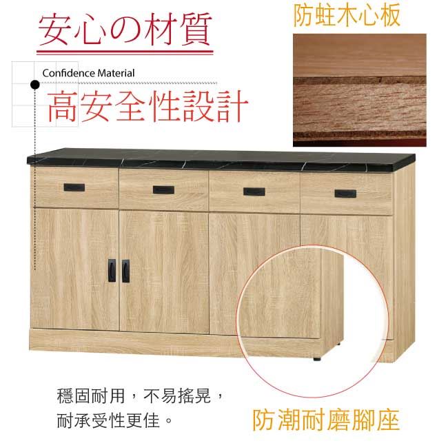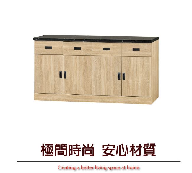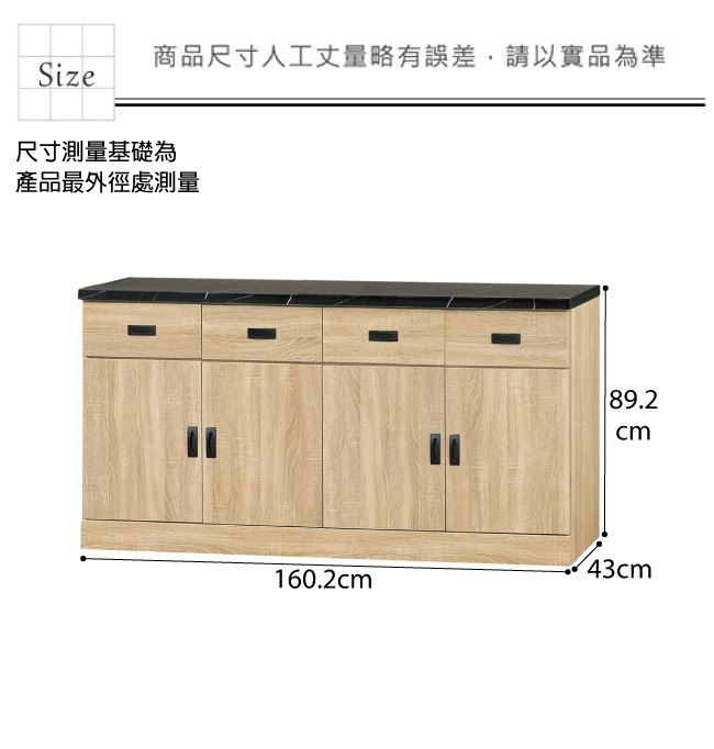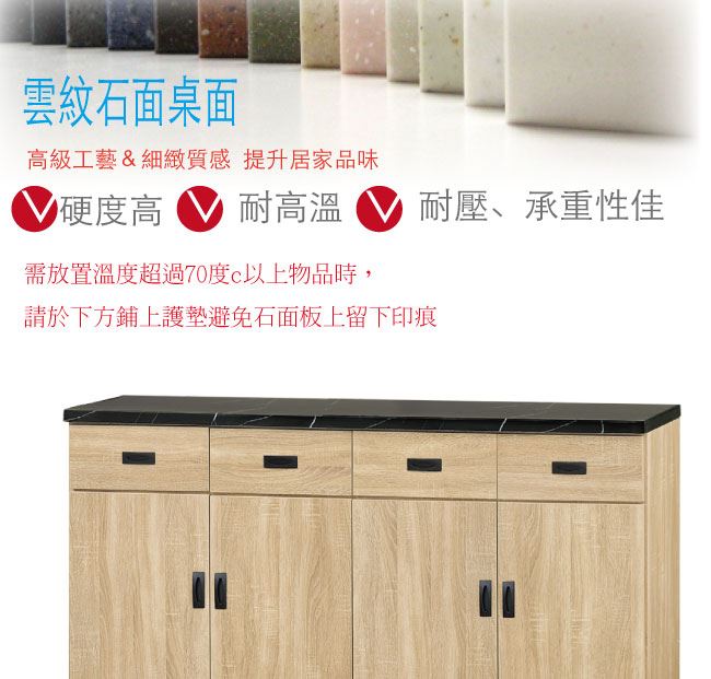 低餐櫃尺寸:(寬)160.2(深)43(高)89.2公分 ◆材質: 材質:防蛀木心板+防潮耐磨腳座+防夾手緩衝門片五金+五金滑軌結構+12mm雲紋石面桌面板 噴漆:防潮耐磨噴漆處理
