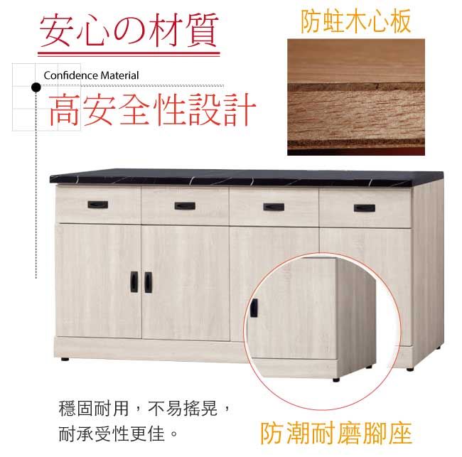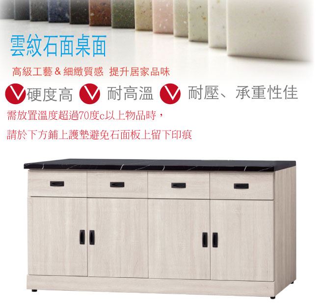 低餐櫃尺寸:(寬)161(深)43(高)84公分 ◆材質: 材質:防蛀木心板+防潮耐磨腳座+防夾手緩衝門片五金+五金滑軌結構+12mm雲紋石面桌面板 噴漆:防潮耐磨噴漆處理