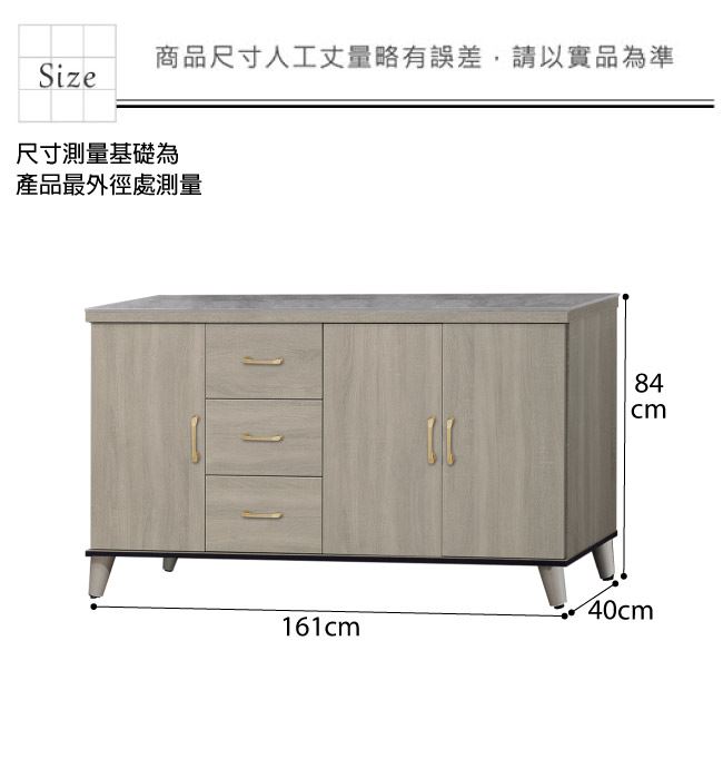 低餐櫃尺寸:(寬)161(深)40(高)84公分 ◆材質: 材質:防蛀木心板+防潮耐磨腳座+防夾手緩衝門片五金+五金滑軌結構+12mm高硬度岩板桌面板 噴漆:防潮耐磨噴漆處理