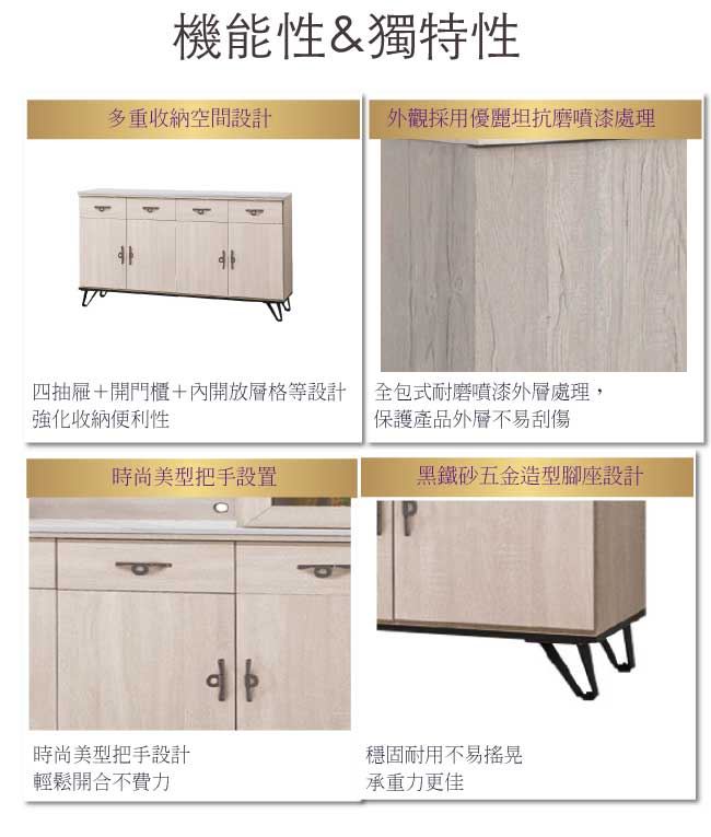 商品 介紹 | 【綠家居】曼塔5.3尺岩板低餐櫃/收納櫃 淺橡木紋色系+現代簡約風格+安心材質製造,整體採用防蛀木心板+黑鐵砂腳座+防夾手緩衝門片五金+五金滑軌結構+12mm高硬度岩板石桌面板等安心材質製造,產品外層採用防潮耐磨噴漆處理搭配採用開門櫃+四抽屜+內開放式層格等空間設計,全由專人配送到家,專業安心服務,替你省下更多時間! 【商品特色】 淺橡木紋色系+現代簡約風格+安心材質製造,使用放心+搭配居家更便利 採用防蛀木心板+黑鐵砂腳座+防夾手緩衝門片五金+五金滑軌結構+12mm高硬度岩板石桌面板等安心材質製造 產品外層採用防潮耐磨噴漆處理 搭配採用開門櫃+四抽屜+內開放式層格等空間設計 此商品不需要DIY組立,此商品為組立後之成品 全由專人配送到家,專業安心服務,替您省下更多時間 |