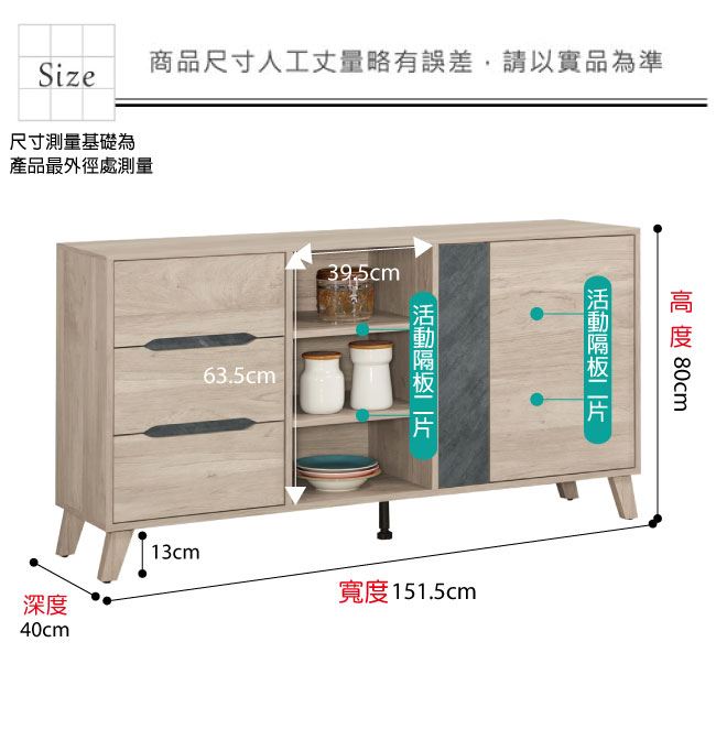 材質 | ◆產品名稱:【綠家居】比克坡5.1尺開門三抽低餐櫃 尺寸:(寬)151.5x(深)40(高)80公分 ◆材質: 材質:防蛀木心板+防潮耐磨腳座+五金滑軌結構 噴漆:防潮耐磨噴漆處理