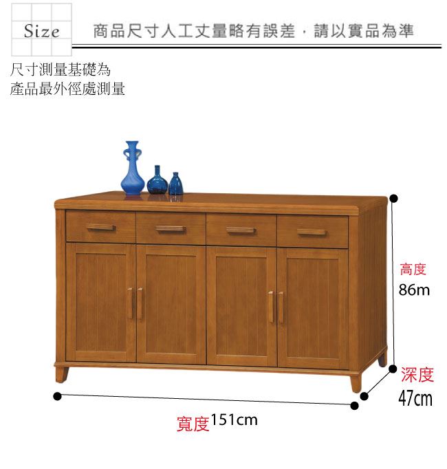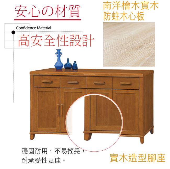 材質 | ◆產品名稱:【綠家居】梅利實木5尺四門四抽餐櫃 尺寸:(寬)151x(深)47(高)86/公分 ◆材質: 材質:進口南洋檜木實木+防蛀木心板+防刮耐磨腳座+五金滑軌結構 噴漆:防潮耐磨噴漆處理
