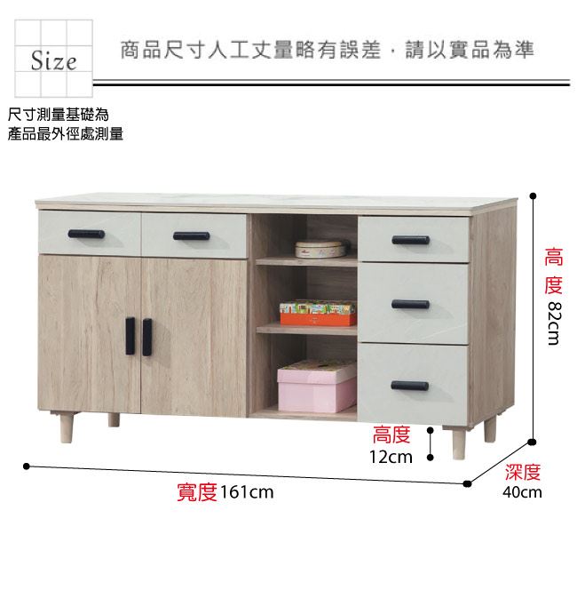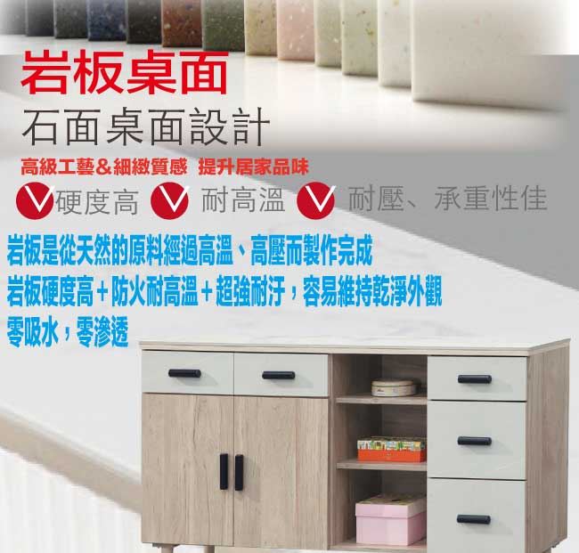 材質 | ◆產品名稱:【綠家居】卡爾夫岩板5.4尺二門五抽餐櫃 尺寸:(寬)161x(深)40(高)82公分 ◆材質: 材質:防蛀木心板+防潮耐磨腳座+五金滑軌結構+防夾手緩衝門片五金+12mm高硬度岩板桌面板 噴漆:防潮耐磨噴漆處理