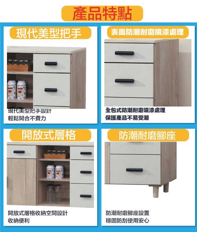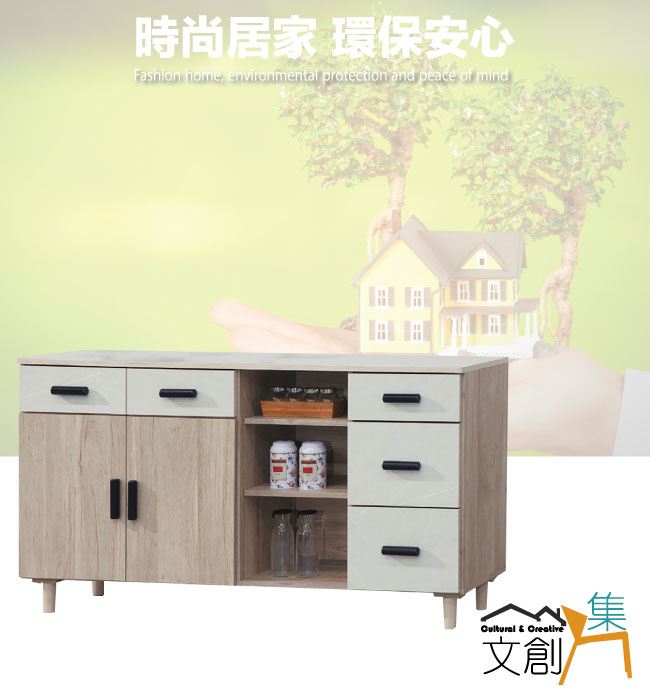 商品 介紹 | 【綠家居】卡爾夫5.4尺二門五抽餐櫃 木紋雙色系+現代簡約風格+安心材質製造,使用放心+搭配居家更便利,整體採用防蛀木心板+防潮耐磨腳座+防夾手緩衝門片五金+五金滑軌結構等材質搭配外層採用優莉坦耐磨全包式噴漆處理 ,採用開門櫃+五抽屜+內&外開放層格等收納空間設計,全由專人配送到家,專業安心服務,替你省下更多時間! 【商品特色】 木紋雙色系+現代簡約風格+安心材質製造,使用放心+搭配居家更便利 防蛀木心板+防潮耐磨腳座+防夾手緩衝門片五金+五金滑軌結構等材質 採用開門櫃+五抽屜+內&外開放層格等收納空間設計 此商品不需要DIY組立,此商品為組立後之成品 品質保證、專業設計、貼心服務 全由專人配送到家,專業安心服務,替您省下更多時間 |