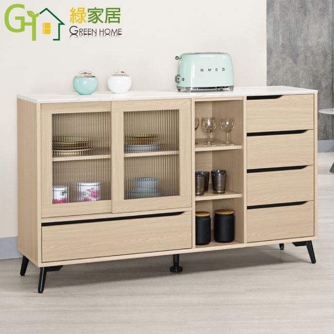 商 品 介 紹 | 【綠家居】蘭達5尺推門玻璃五抽低餐櫃 橡木紋色系+現代簡約風格+安心材質製造,整體採用防蛀木心板+烤漆金屬腳座+五金滑軌結構+5mm直紋強化玻璃+仿石面紋路桌面板(美耐皿材質)等安心材質製造,產品外層採用防潮耐磨噴漆處理搭配採用推門櫃+五抽屜+內&外開放層格等收納空間設計,全由專人配送到家,專業安心服務,替你省下更多時間! 【商品特色】 橡木紋色系+現代簡約風格+安心材質製造,使用放心+搭配居家更便利 採用防蛀木心板+烤漆金屬腳座+五金滑軌結構+5mm直紋強化玻璃+仿石面紋路桌面板(美耐皿材質)等安心材質製造 搭配採用推門櫃+五抽屜+內&外開放層格等收納空間設計 此商品不需要DIY組立,此商品為組立後之成品 品質保證、專業設計、貼心服務 全由專人配送到家,專業安心服務,替您省下更多時間