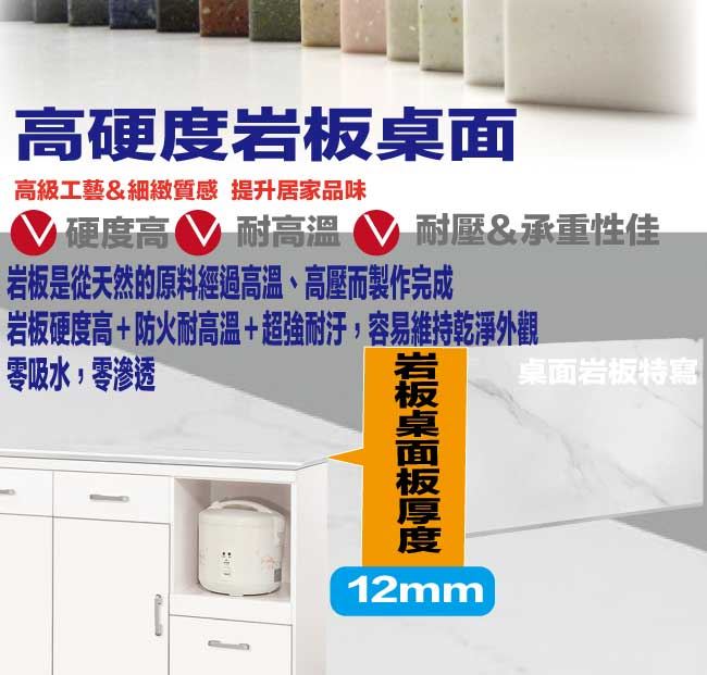 材質 | ◆產品名稱:【綠家居】巴克雅5.4尺岩板四抽拉盤低餐櫃/收納櫃 尺寸:(寬)161x(深)41(高)85/公分 ◆材質: 材質:防蛀木心板+防潮耐磨腳座+五金滑軌結構+12mm高硬度岩板桌面板 表面防潮亮面噴漆處理 |