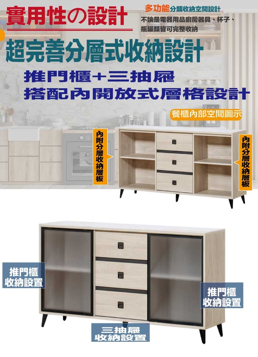 搭配採用推門櫃+三抽屜+內開放層格等收納空間設計