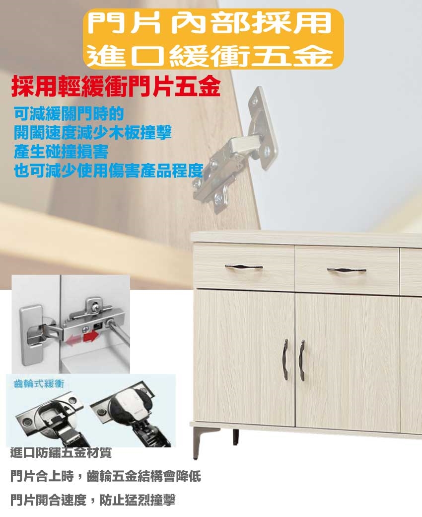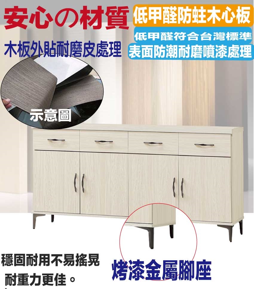 採用防蛀木心板+烤漆金屬腳座+防夾手緩衝門片五金+五金滑軌結構等安心材質製造