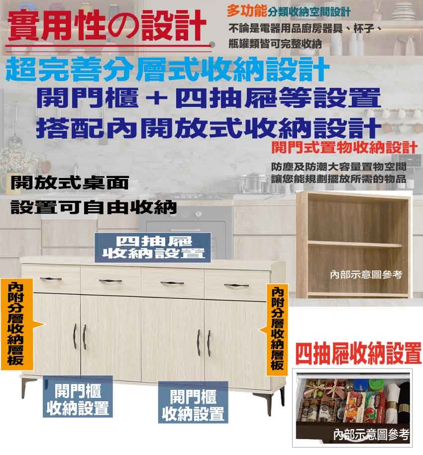 搭配採用開門櫃+四抽屜+內開放層格等收納空間設計