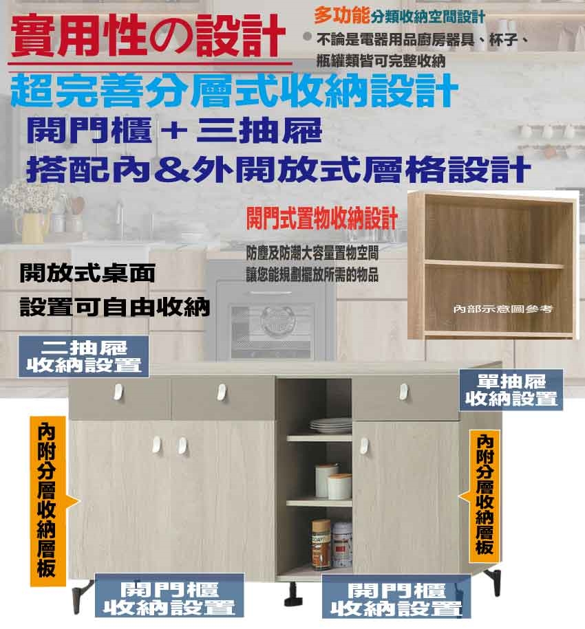 搭配採用開門櫃+三抽屜+內&外開放層格等收納空間設計