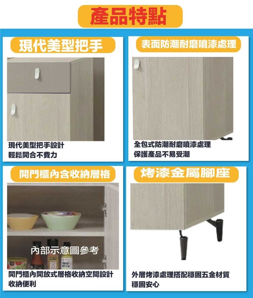 材質:防蛀木心板+防夾手緩衝五金+烤漆五金腳座+五金滑軌結構