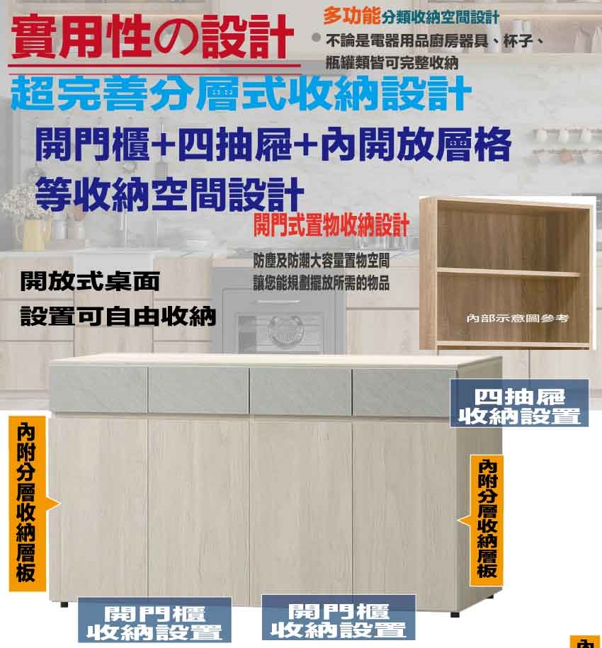 搭配採用開門櫃+四抽屜+內開放層格等收納空間設計