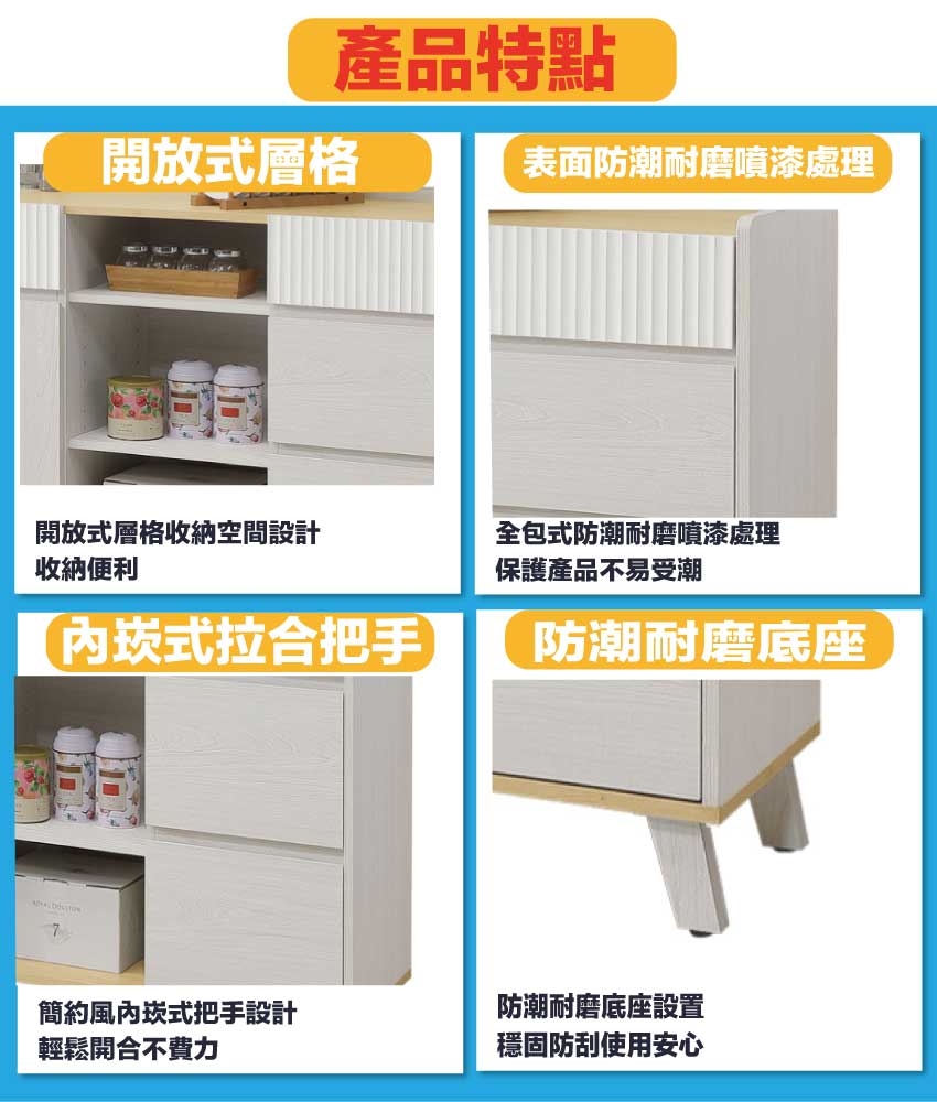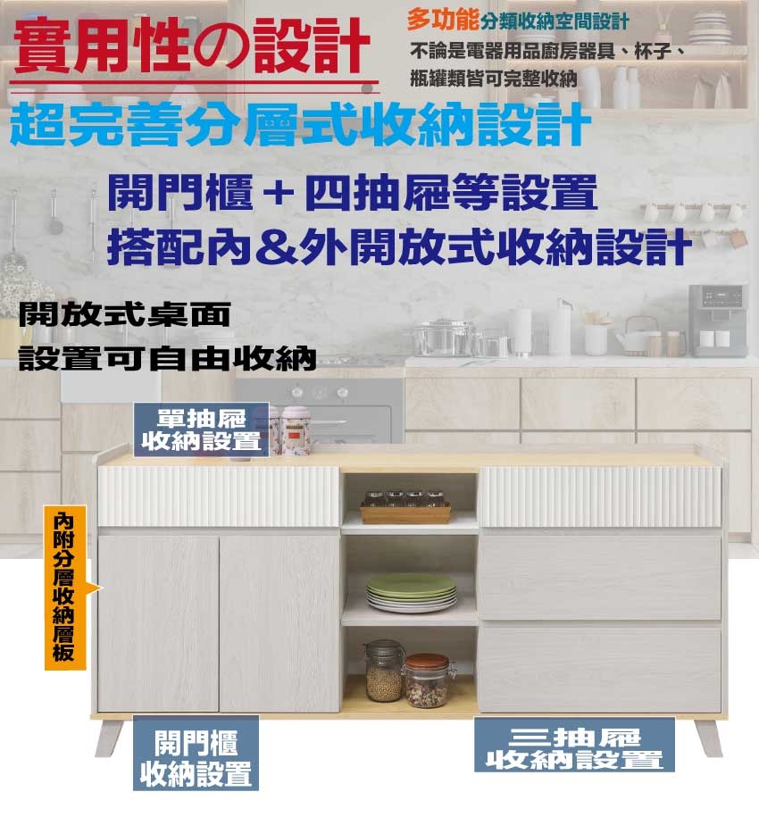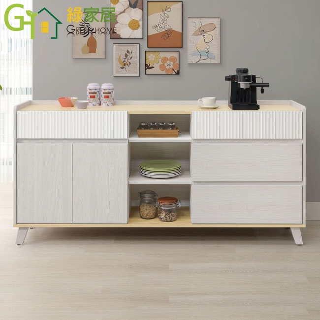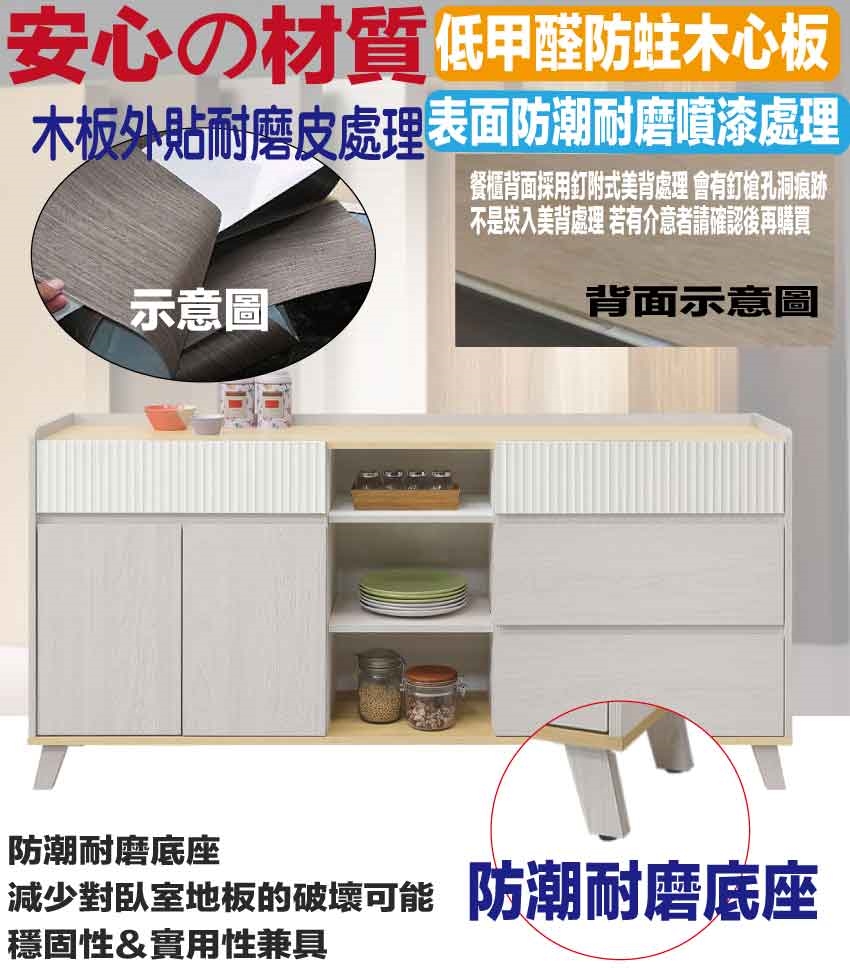 ★偏遠地區需額外加收運費,下標請先問與答詢問★ ★下訂前注意 由於商品流動較快,下訂前請先詢問是否有貨在下訂喔~★ 【綠家居】德爾6尺二門四抽餐櫃 木紋雙色系+現代簡約風格+安心材質製造,使用放心+搭配居家更便利,整體採用防蛀木心板+防潮耐磨腳座+五金滑軌結構等材質製造搭配外層採用優莉坦耐磨全包式噴漆處理 ,採用開門櫃+四抽屜+開放層格等收納空間設計,全由專人配送到家,專業安心服務,替你省下更多時間!