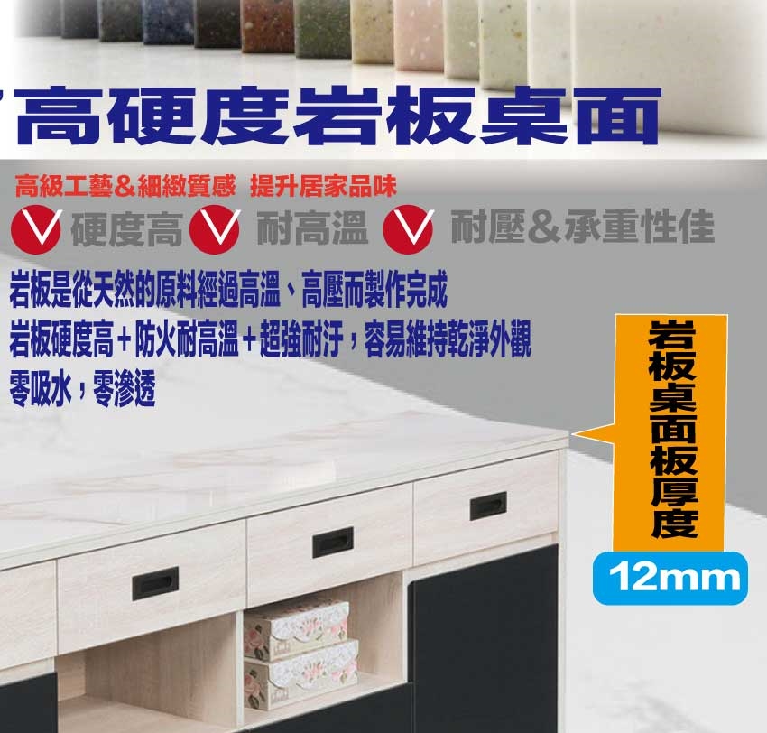 材質:防蛀木心板+五金滑軌結構+烤漆五金腳座+12mm高硬度岩板桌面板