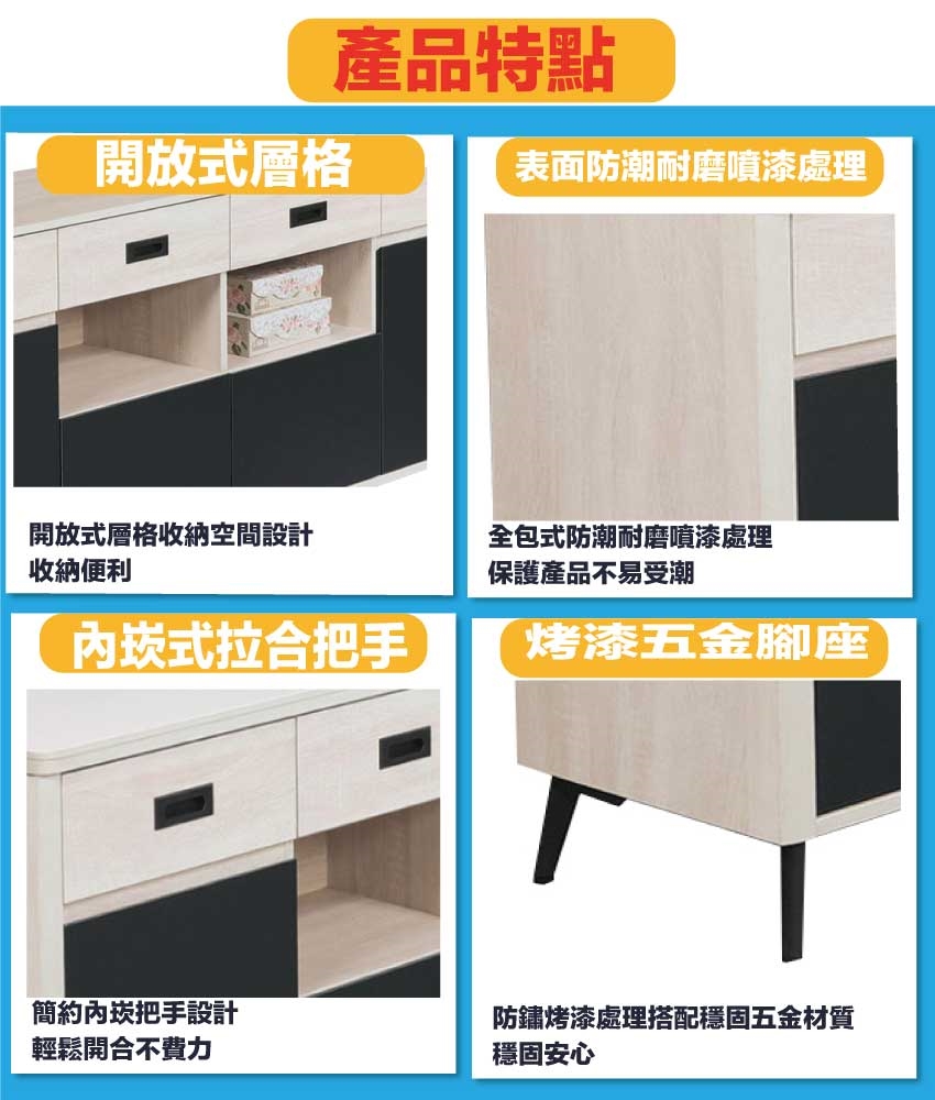 搭配採用開門櫃+四抽屜+內&外開放層格等收納空間設計