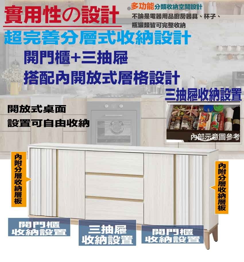 搭配採用開門櫃+三抽屜+內開放層格等收納空間設計