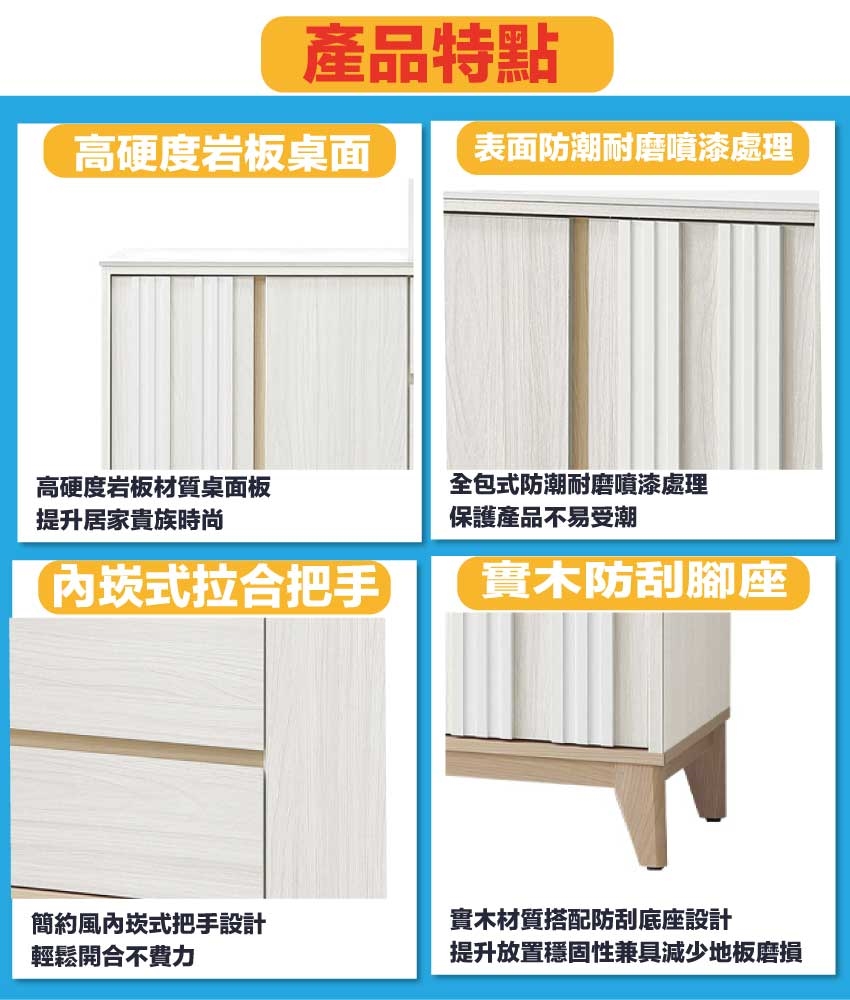 材質:防蛀木心板+防刮實木腳座(腳高12cm)+五金滑軌結構+12mm高硬度岩板桌面板+防夾手緩衝門片五金