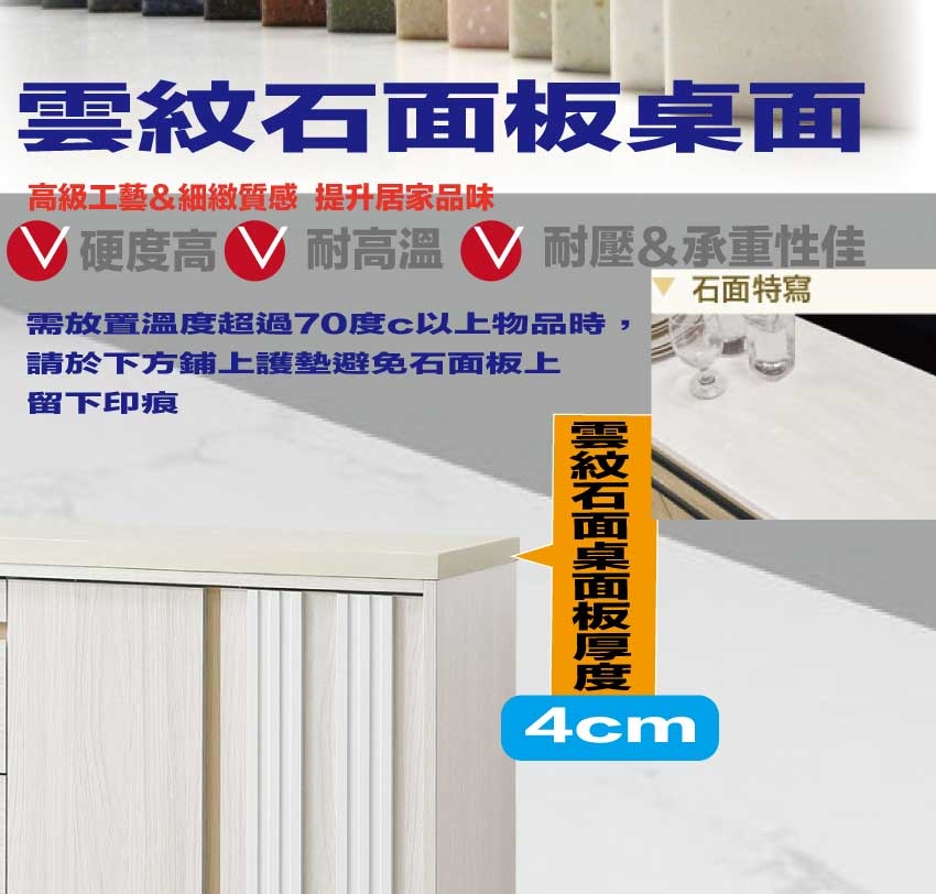 材質:防蛀木心板+防刮實木腳座(腳高12cm)+五金滑軌結構+4cm雲紋石面桌面板+防夾手緩衝門片五金