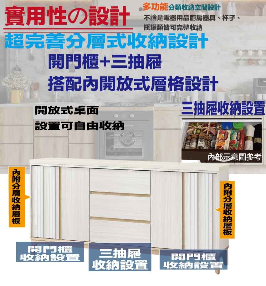 搭配採用開門櫃+三抽屜+內開放層格等收納空間設計