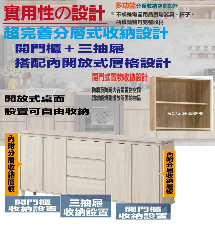 搭配採用開門櫃+三抽屜+內開放層格等收納空間設計