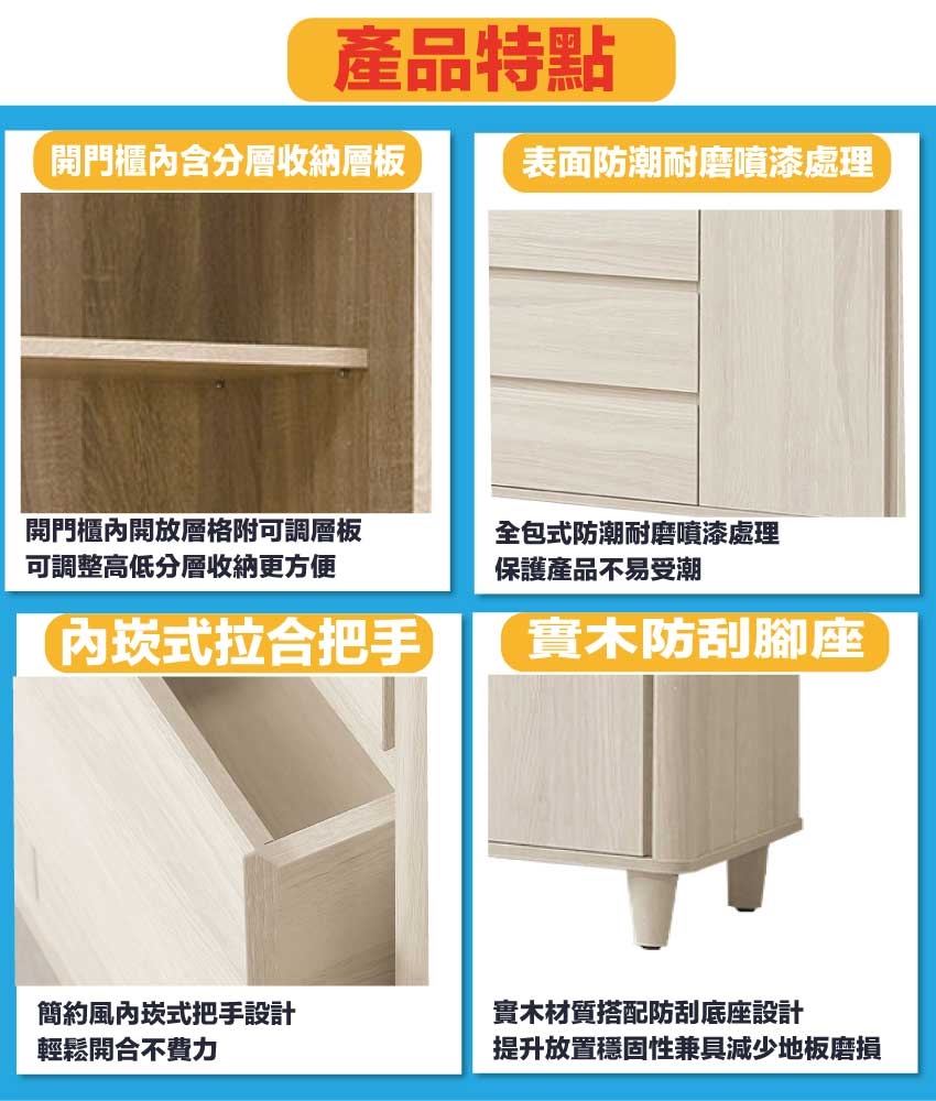 材質:防蛀木心板+防刮實木腳座(腳高11cm)+五金滑軌結構+防夾手緩衝門片五金